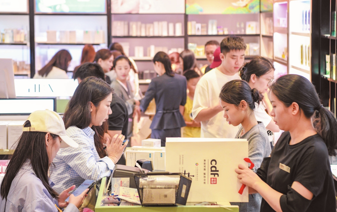 5月4日,cdf海口日月广场免税店内人流如织,各类促销活动吸引了不少消费者前来选购。本报记者 苏弼坤 摄