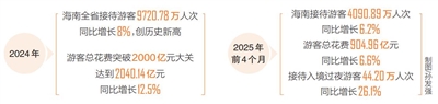 2024年海南全省接待游客9720.78万人次,同比增长8%,创历史新高;游客总花费突破2000亿元大关,达到2040.14亿元,同比增长12.5%。2025年前4个月,海南接待游客4090.89万人次,同比增长6.2%;游客总花费904.96亿元,同比增长6.6%;接待入境过夜游客44.20万人次,同比增长26.1%。