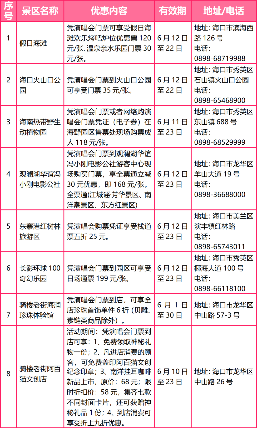 音乐狂欢+旅行畅玩!来海口感受双倍快乐。在陈奕迅演唱会期间,凭演唱会门票,即可解锁以下景区超值福利,让你的旅程“声”动加倍!