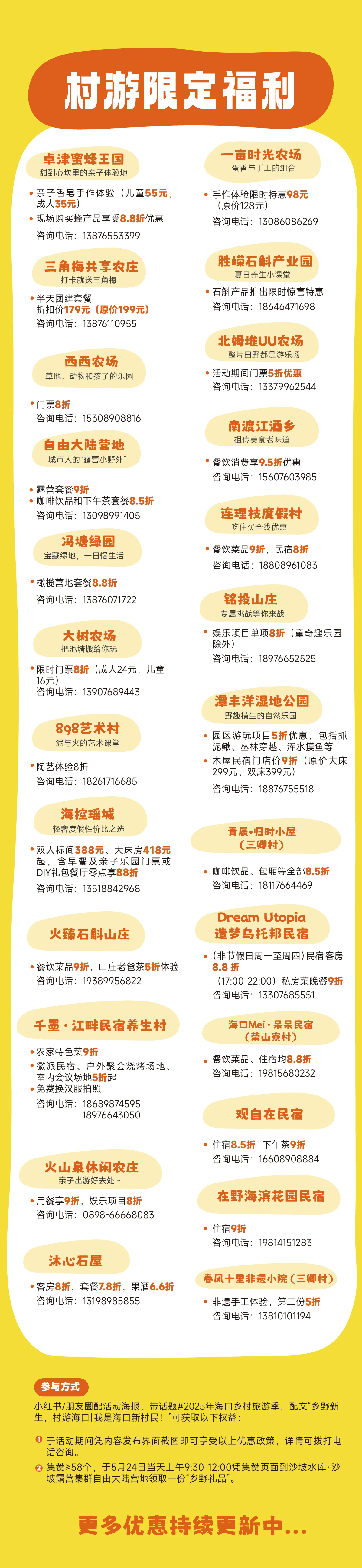 「精神村民」召集令,小红书/朋友圈配活动海报,带话题#2025年海口乡村旅游季,配文“乡野新生,村游海口 | 我是海口新村民!”可获取以下权益: