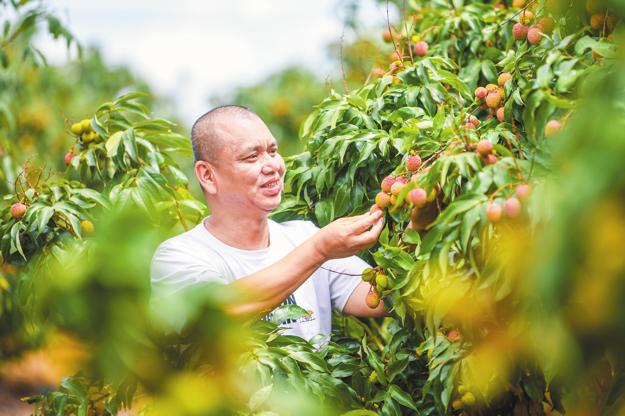 5月16日,在琼山区三门坡镇福湖火山荔枝种植示范基地,荔农正查看荔枝成熟度。本报记者 苏弼坤 摄