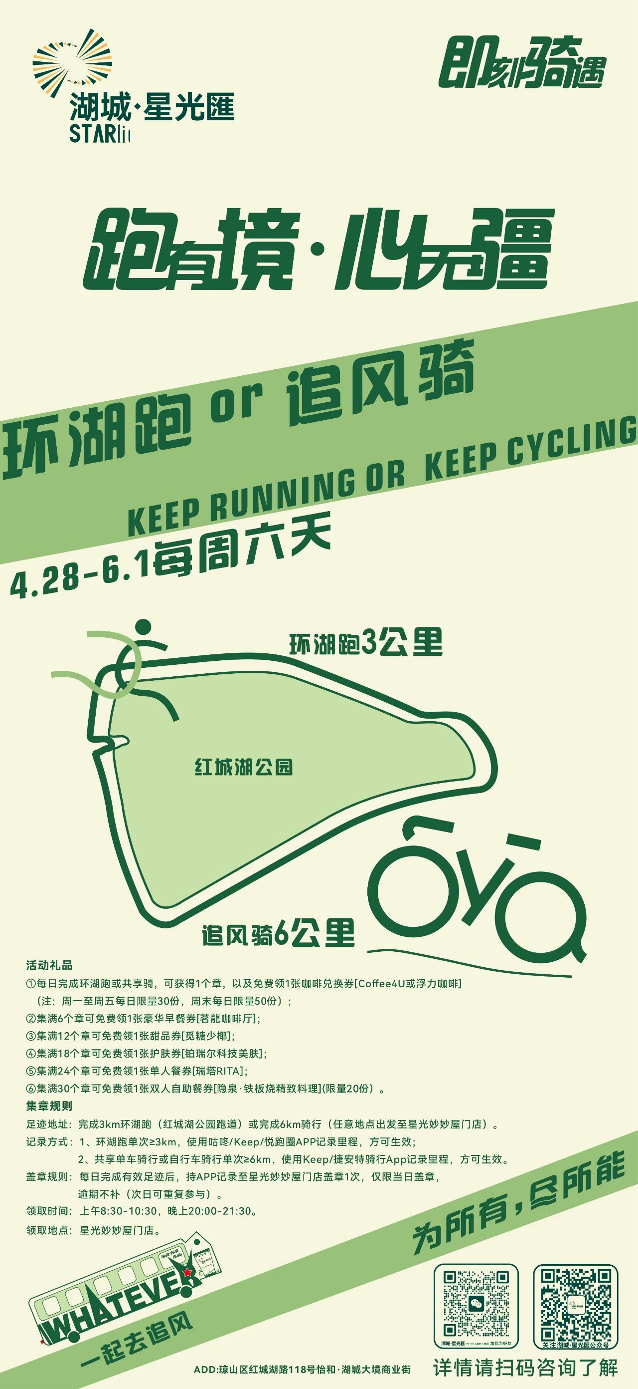 除此之外,湖城·星光匯策划的跑有境·心无疆--即刻骑遇活动还将持续至6月1日,市民游客完成3km环湖跑(红城湖公园跑道)或完成5km追风骑行(任意地点出发至星光妙妙屋门店),盖章领券,享受超多福利。