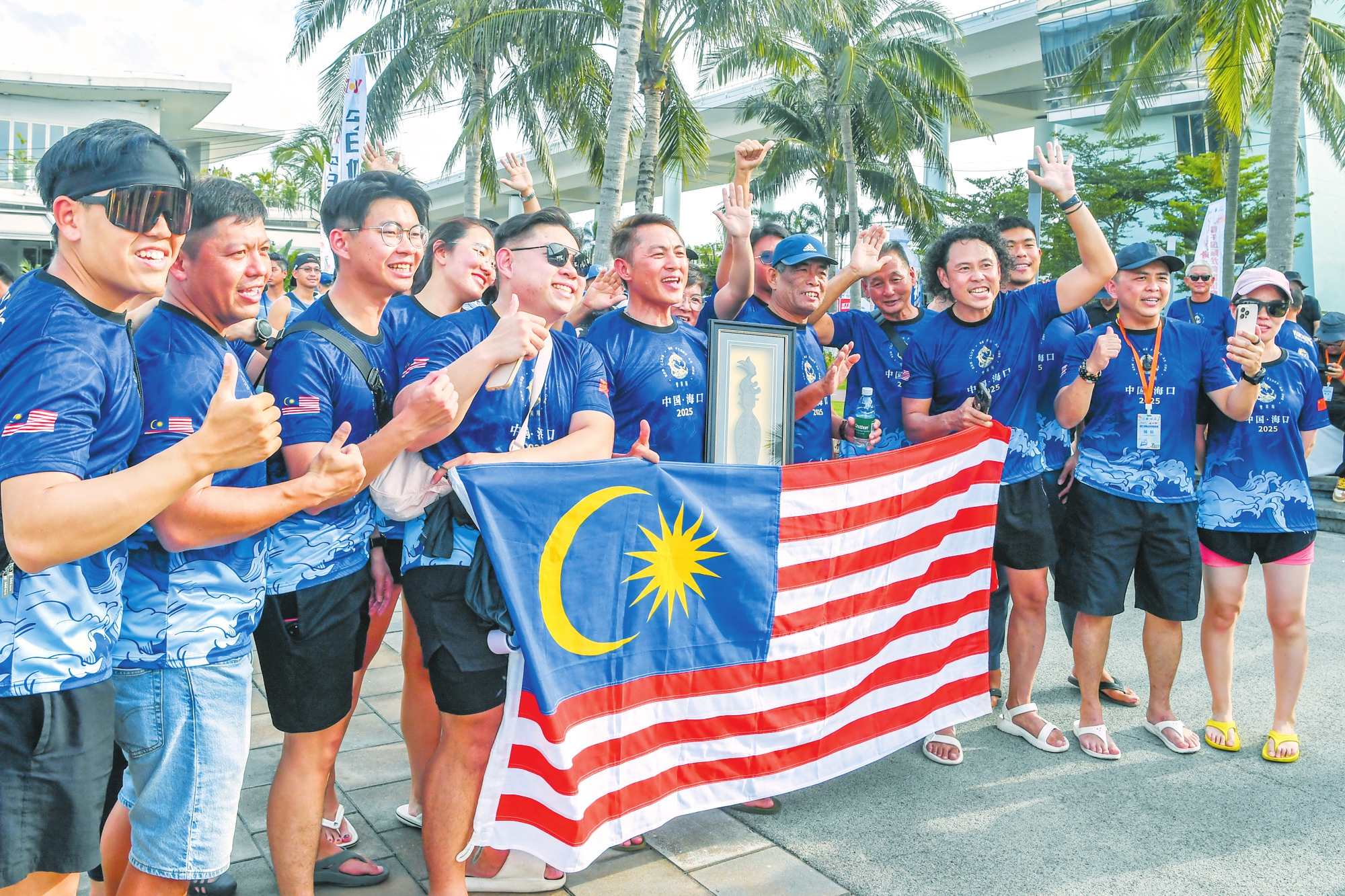 6月1日,来自马来西亚的龙舟代表队成员在比赛现场合影留念。 本报记者 孙士杰 摄