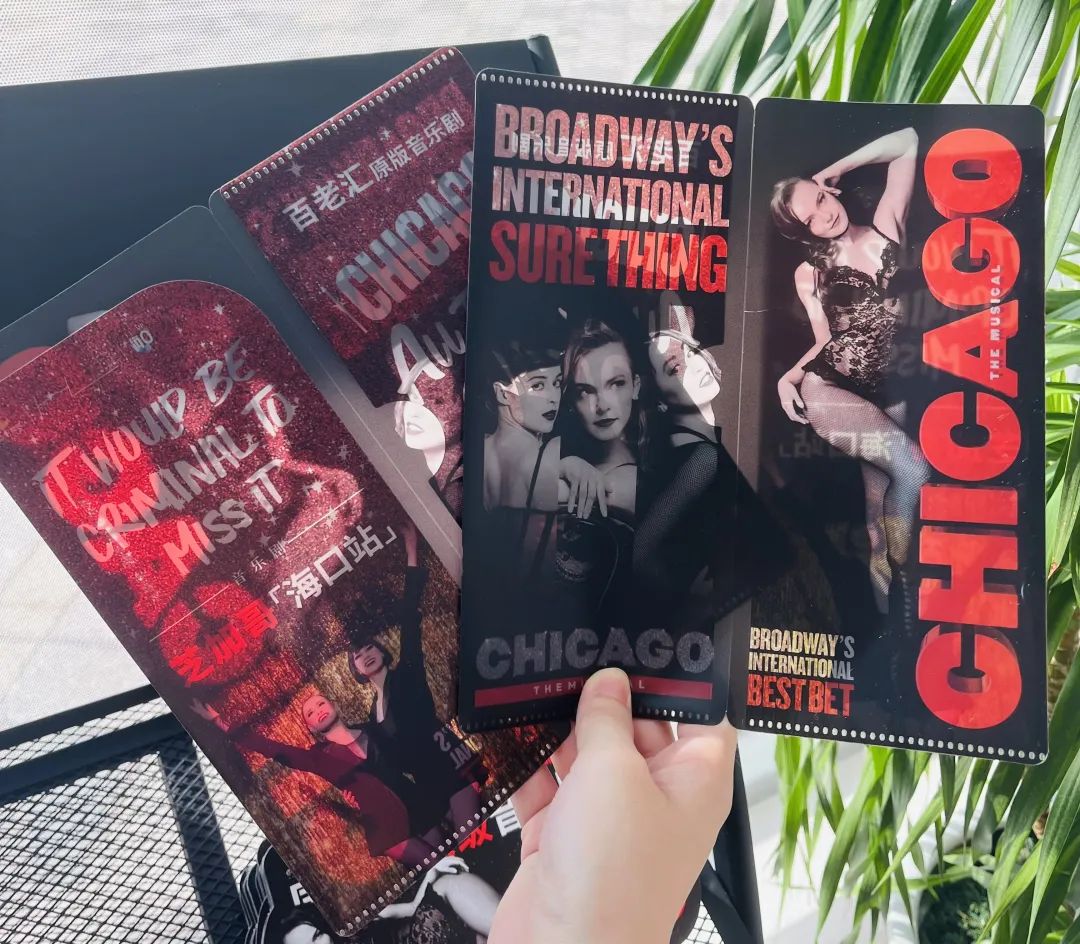 关注@海口湾演艺中心微信公众号/微博/小红书/抖音任意社交媒体账号,小红书平台发布《芝加哥》相关任意笔记,带话题#当芝加哥遇上椰城,演前1小时,凭当场演出票和社交媒体发文凭证,工作人员审核通过后,可领取芝加哥海口站限定票夹一个。