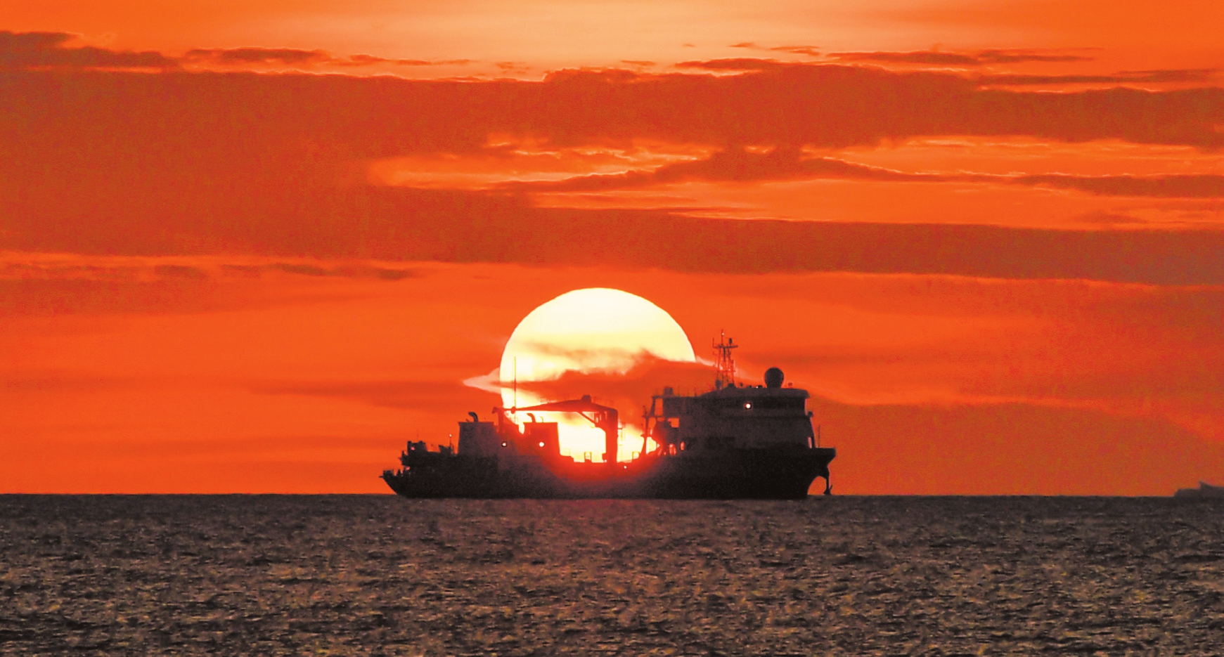 6月5日,在海口湾,渐渐接近海平面的落日与船只形成一幅美妙的画面。 本报记者 康登淋 摄