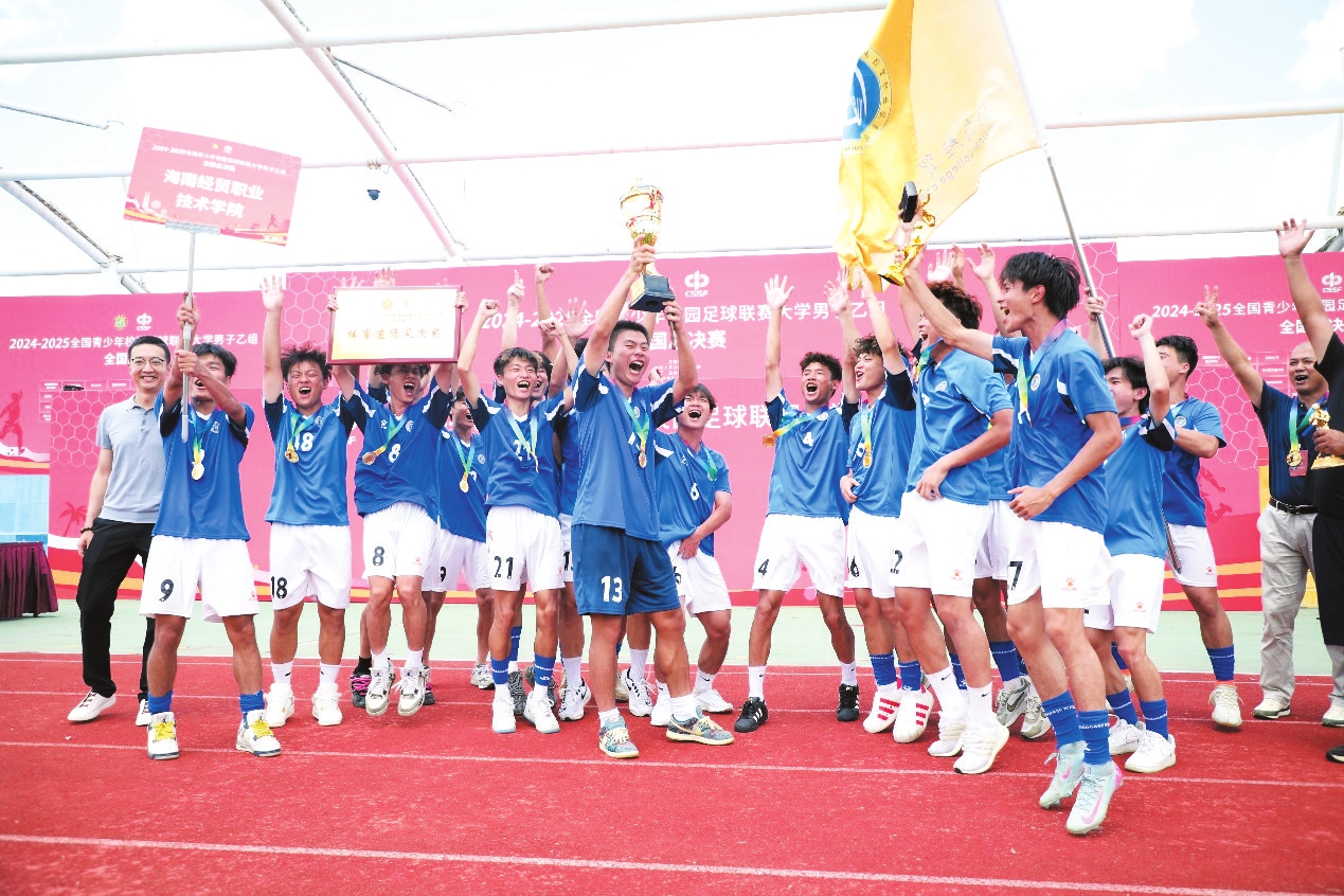 6月7日,经过10天的激烈角逐,2024-2025全国青少年校园足球联赛大学男子乙组总决赛在海口观澜湖·中国足球(南方)训练基地落幕。海南经贸职业技术学院队在决赛中1:0击败广东工贸职业技术学院队夺冠,这是他们第二次在这项全国大赛中夺得冠军。广东工贸职业技术学院队获亚军,新疆农业大学队获季军。