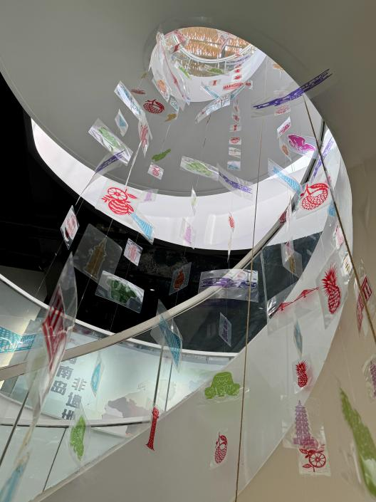 步入展厅,一幅极具海南特色的艺术画卷徐徐展开。中央区域,海南热带水果与海口地标建筑的剪纸组合凌空悬挂,巧妙构成 “海南特色图谱”,观众置身其中,仿若踏入浓缩的海南文化叙事场域。