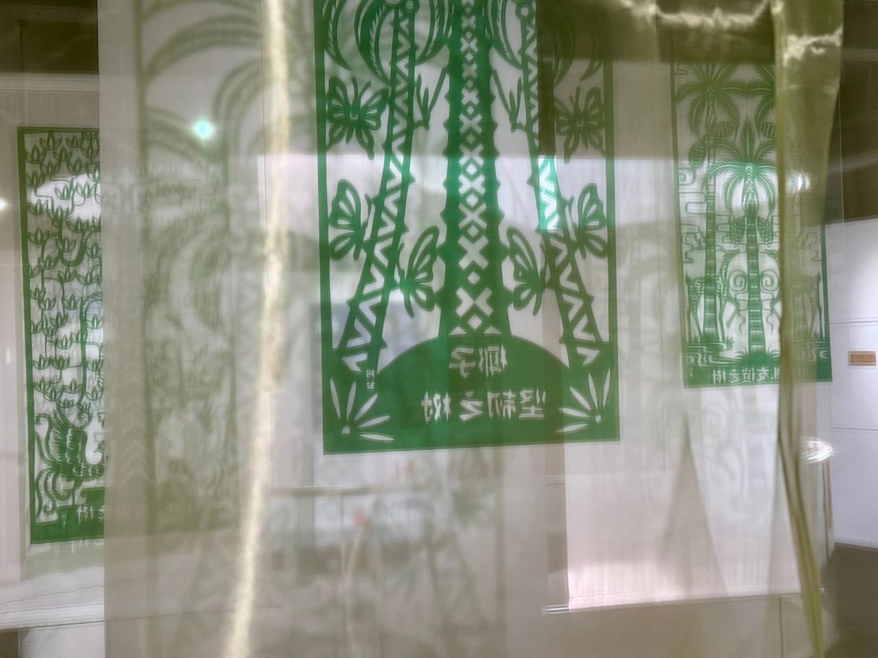 二楼展区更是匠心独运,以蓝色帷幔塑造 “海浪” 意象,剪纸作品于层层叠叠的蓝色波浪间优雅舒展;另一侧的 “绿色幻境”,凭借纱幔与投影,营造出神秘的雨林秘境,剪纸本体与摇曳树影相互映衬,形成 “实 — 虚 — 影” 三重空间层次,带来极具冲击力的视觉享受。