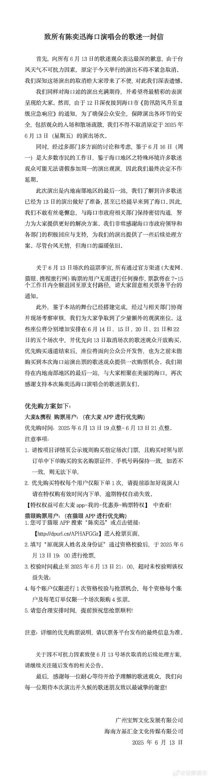 6月13日14时40分,广州宝辉文化发展有限公司、海南方基汇金文化传媒有限公司发布《致所有陈奕迅海口演唱会的歌迷一封信》。