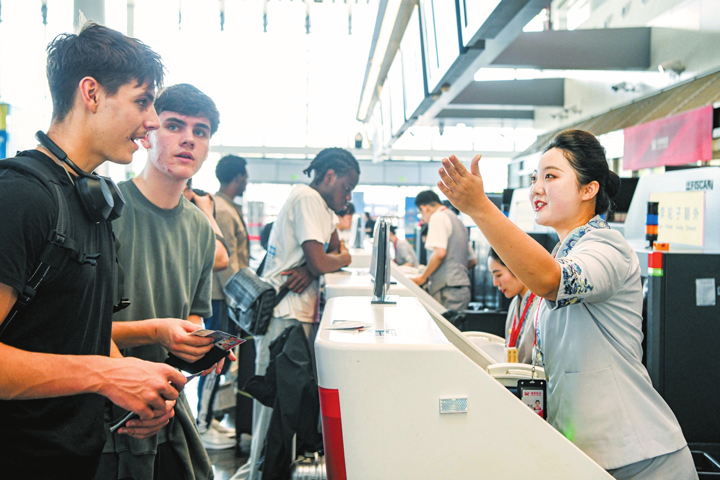 海南航空海口至伦敦国际航线开通后,乘坐该航班的旅客在海口美兰国际机场办理值机手续。 本报记者 苏弼坤 摄