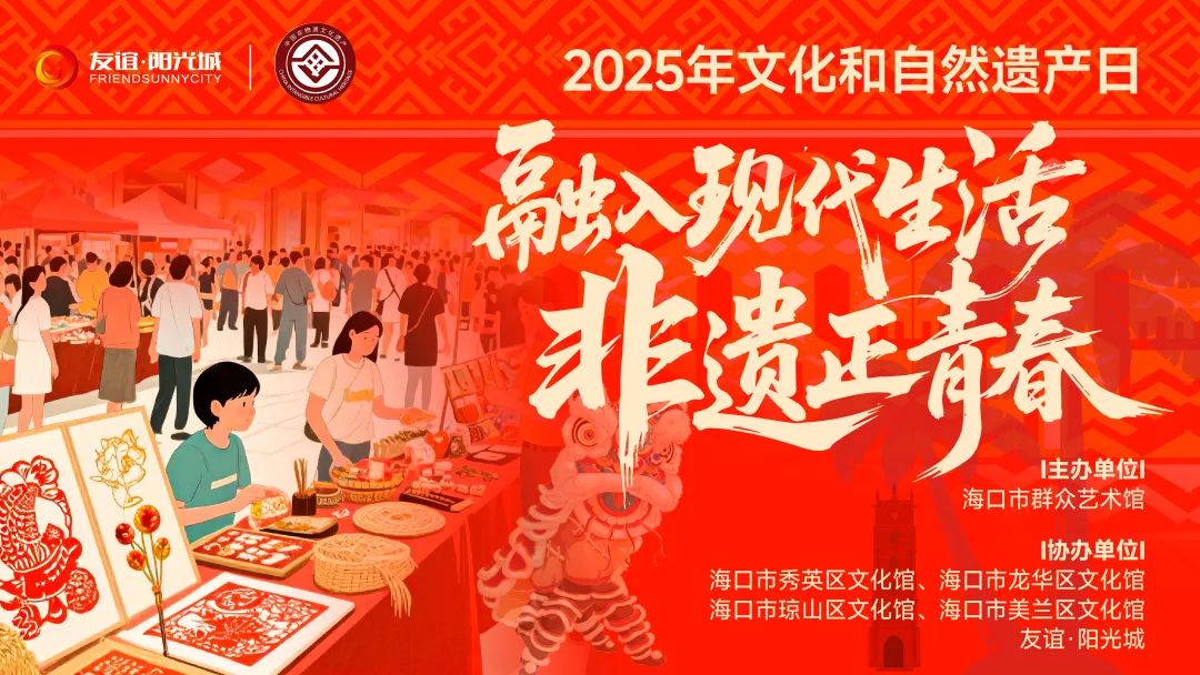2025年“文化和自然遗产日”即将到来。今年,海口市群众艺术馆联合各区文化馆及友谊·阳光城,以“融入现代生活——非遗正青春”为主题,通过“可吃、可玩、可赏、可学”的沉浸式体验,让不同年龄阶段的您,都能在现代商业空间中,近距离感受海口非遗的烟火气与生命力,找到不一样乐趣。