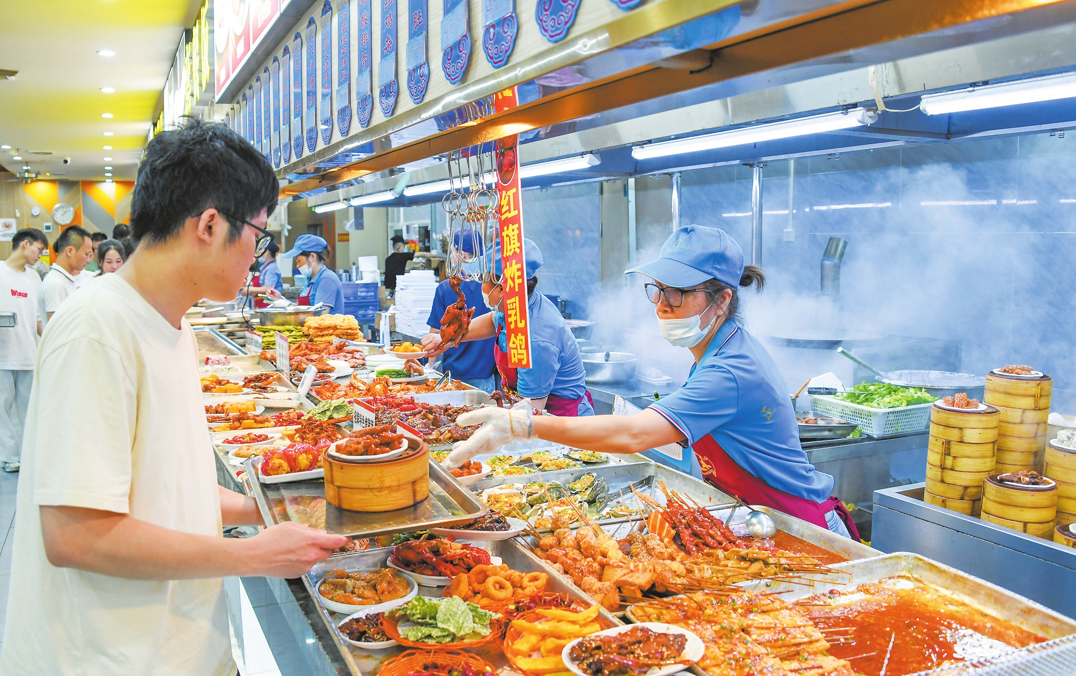 明珠广场的正方华老爸茶店里,各式各样的餐点琳琅满目,食客正在挑选心仪的美食。