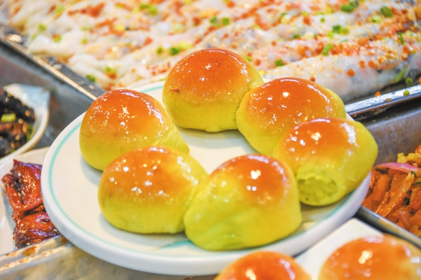 老爸茶店内刚出炉的点心色泽诱人。