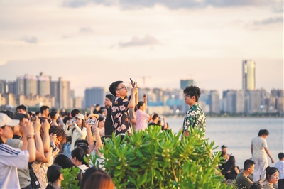海口湾美丽的日落景观吸引不少年轻人观赏。