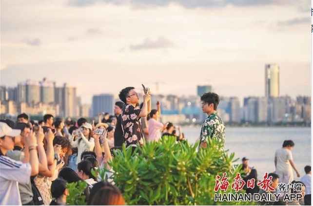 海口湾美丽的日落景观吸引不少年轻人观赏。海南日报全媒体记者 李天平 摄