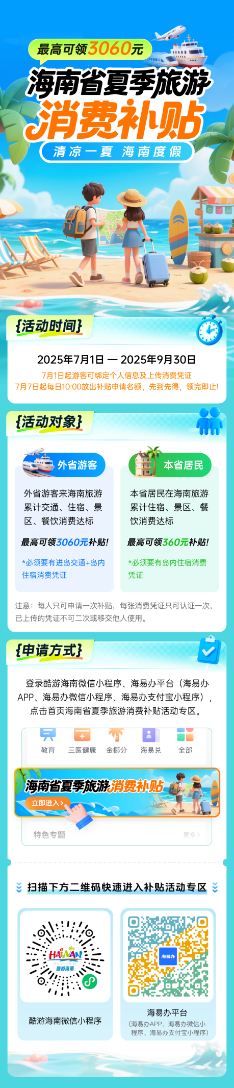 游客通过累计消费并在“酷游海南”或“海易办”双平台系统上传个人旅游消费有效票据凭证,系统将通过大数据和AI技术核验凭证的真实性和金额,核验通过后可享受最低150元至最高3060元的夏季清凉补贴,直接返现到个人银行账户。
