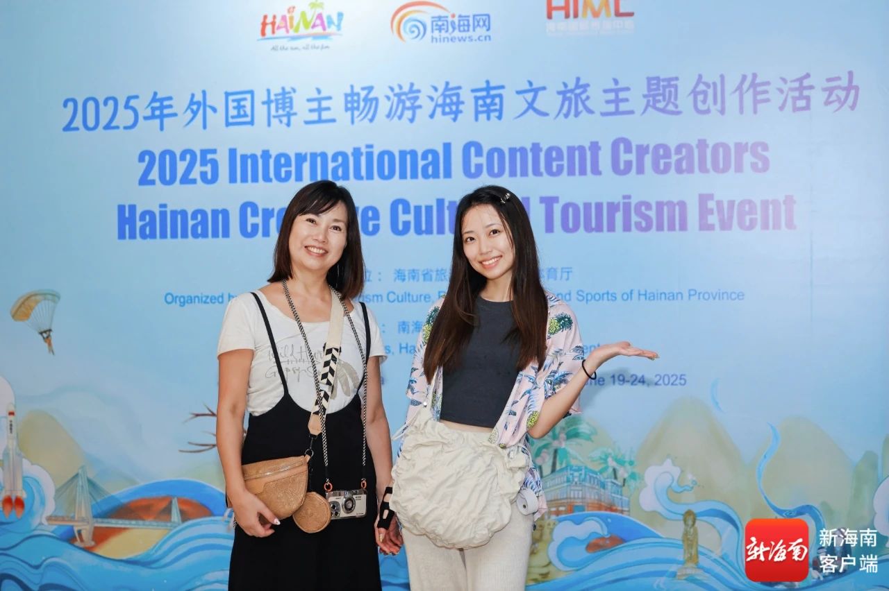 2025年外国博主畅游海南文旅主题创作活动报到日,日本博主世兰和母亲在展板前合影。