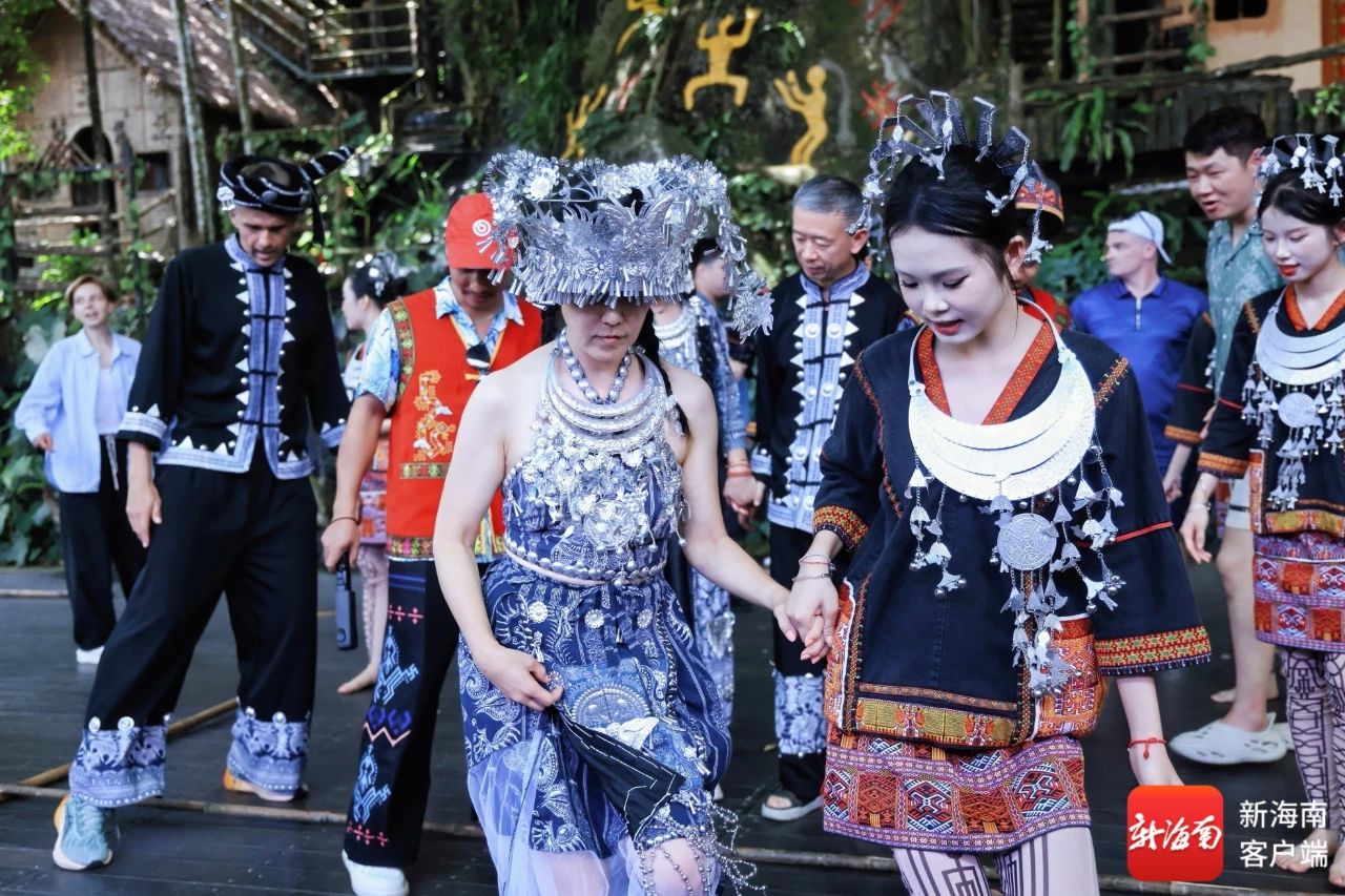 多国博主在保亭槟榔谷黎苗文化旅游区互动打卡。