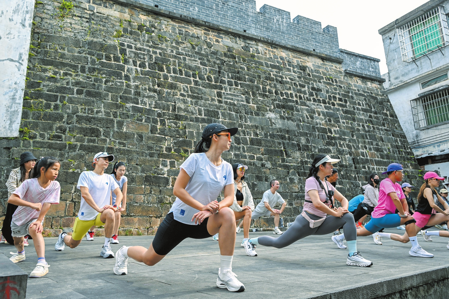 跑者集体热身,准备开启文化探索之旅。本报记者 苏弼坤 摄