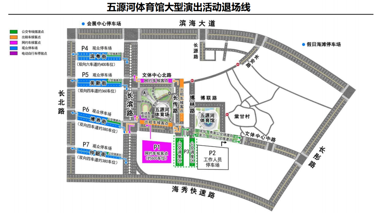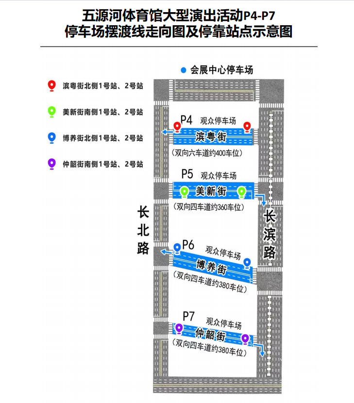 同时,在星茂购物中心、P4和P5停车场、P6和P7停车场开通3条免费公交摆渡线,投放13辆公交车,直达五源河体育馆,观演群众可就近停车,摆渡前往。