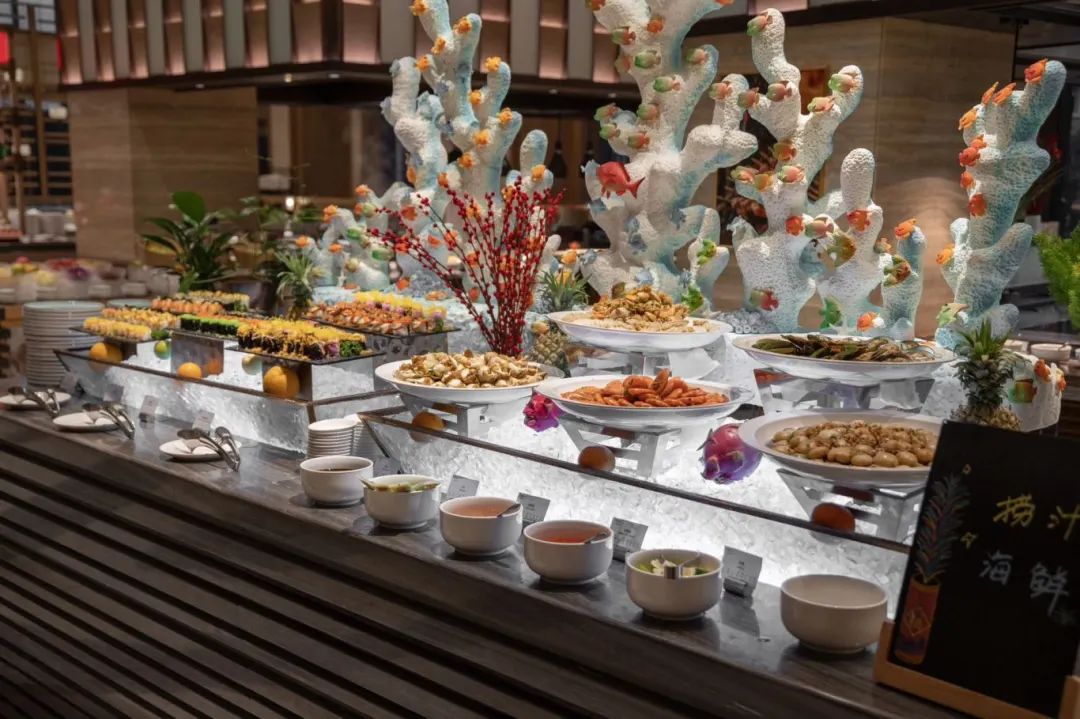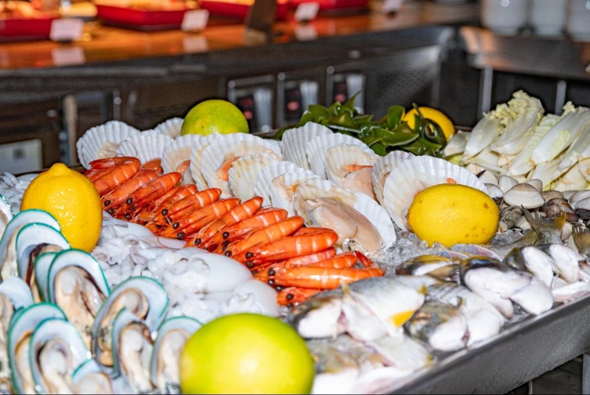 来到这里,若遇正餐时分,移步自助餐区,那才叫一个琳琅满目,活色生香。现切的烤牛肉,香气直冲脑门。海鲜档更是热闹,生猛的大虾、肥美的青口、饱满的蟹腿在碎冰堆里堆成小山,闪着诱人的光泽。