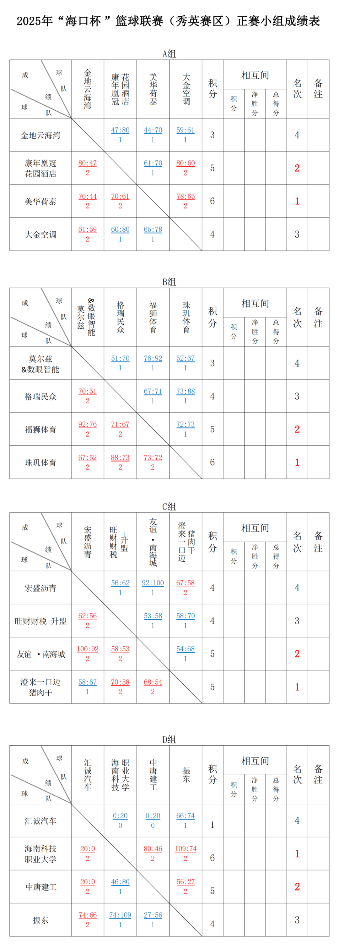 最终,A组中美华荷泰三战全胜获得小组第一,B组珠玑体育险胜1分获得小组第一,C组最为激烈,澄来一口迈猪肉干通过胜负关系获得第一,D组海南科技职业大学轻松获得第一,康年皇冠花园酒店、福狮体育、友谊·南海城和中唐建工分别获得小组第二,这八支队伍将对决争夺海口杯篮球联赛总决赛的入场券。