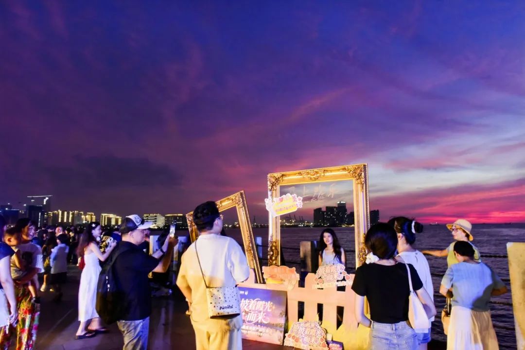 傍晚时分,当忙碌的城市卸下了一天的疲惫,暮色渐起,金黄泛红一缕的霞光浸染了天幕。近几月,海口湾、云洞图书馆、西海岸等海口的海岸线上,站满了举着手机追光的人们,社媒上关于“海口晚霞”的话题讨论也日益激增。晚霞这种不期而遇的自然景观,不仅点亮了天际线,还为海口建设打造国际旅游消费中心增添了新的活力。