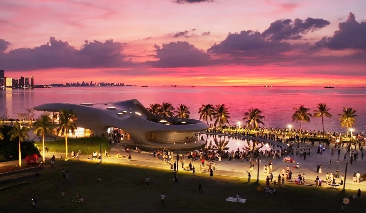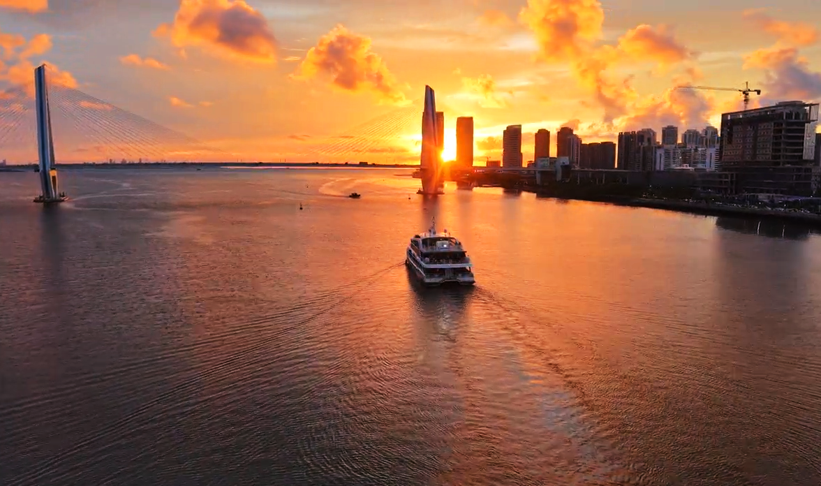 海口拥有160.17千米的海岸线,城市与自然相结合而形成的独有“落日经济带”每一段都有不一样的海岛晚霞体验。在海口湾片区,你可以走进天空之山、云洞图书馆、世纪公园等地,感受现代城市地标与绚烂晚霞的完美融合;乘坐“追光之旅”游船,看晚霞夜游海口湾,感受海风拂面的惬意。