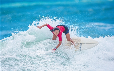 9月11日,在海南万宁日月湾,海南队选手黄莹莹摘得第十四届全运会冲浪项目女子短板决赛金牌。图为黄莹莹在决赛比赛中。 本报记者 袁琛 摄