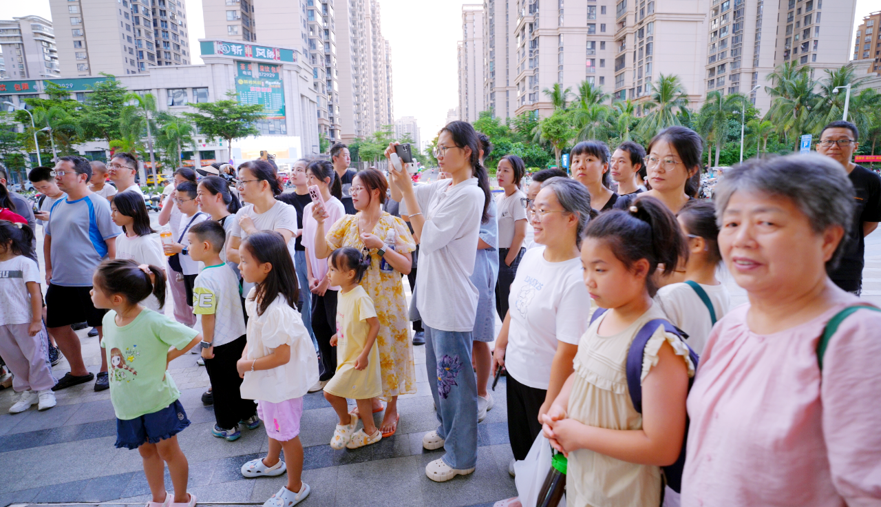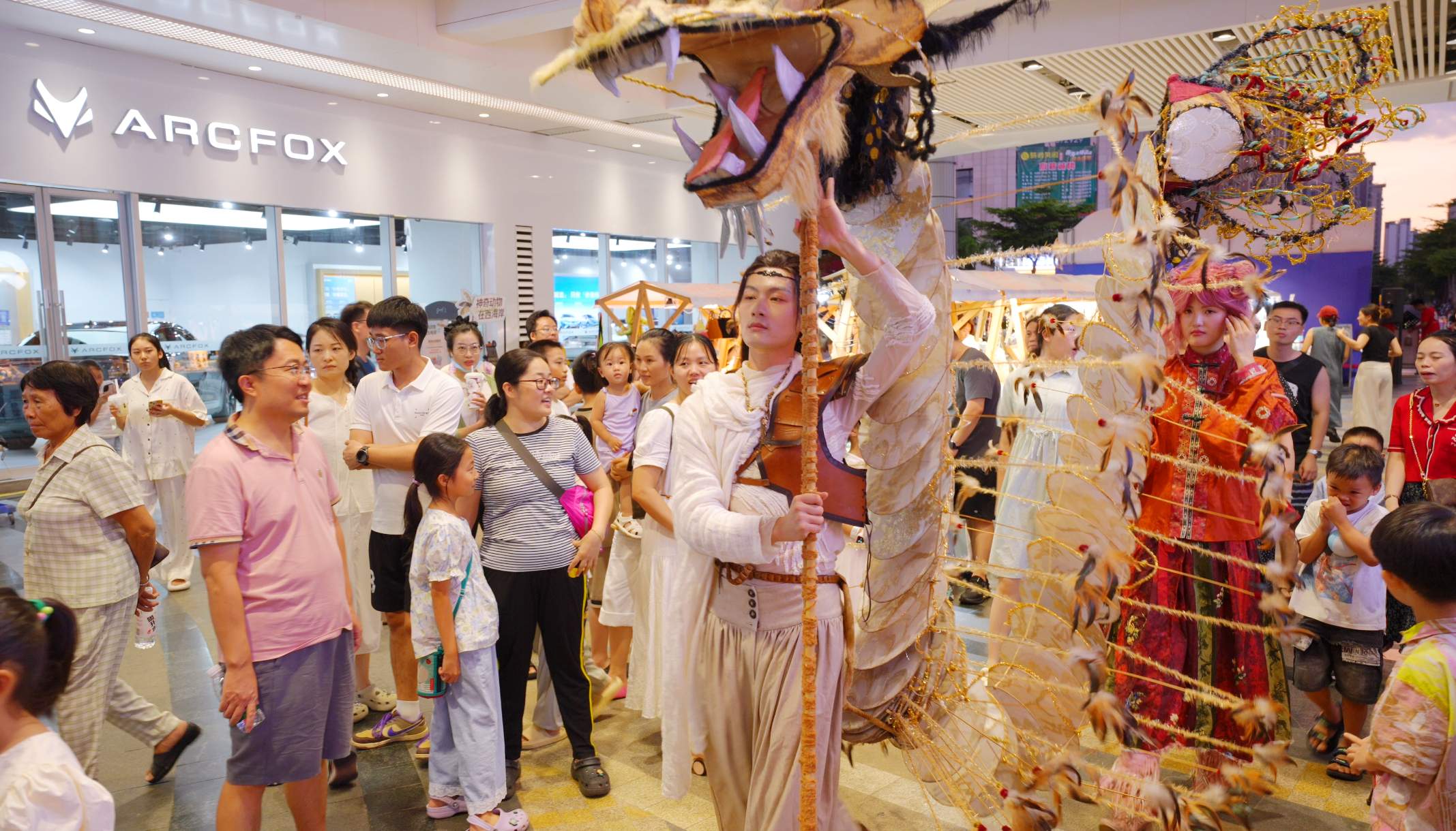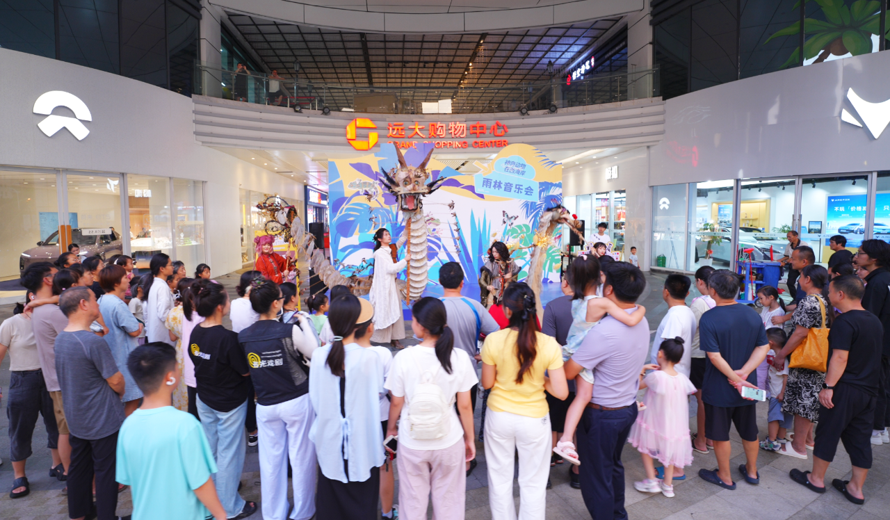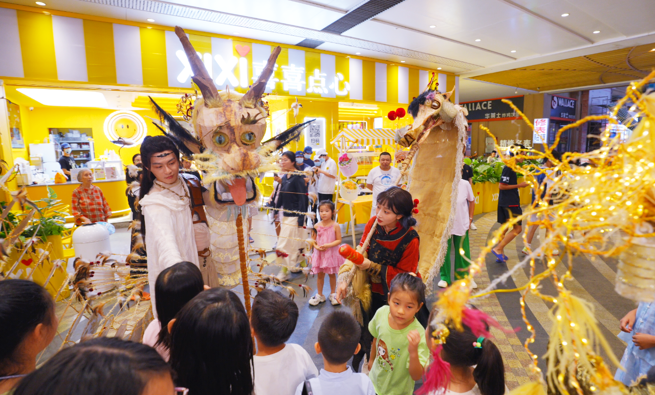 当天,由国内顶尖戏剧团队“有光戏剧”带来的十二时辰系列辰龙《玄龙》剧目,彻底挣脱了镜框式舞台的束缚,所到之处,无不掀起热潮。在海南国际会展中心,龙影随光起舞,磅礴气势直抵人心;在远大购物中心与星茂购物中心繁华熙攘的中庭,巨龙忽而低掠人群,引得惊呼与快门声此起彼伏。