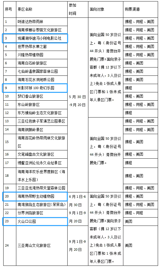 三亚南山文化旅游区、海南热带野生动植物园、火山口公园、南湾猴岛生态旅游区(呆呆岛)、分界洲岛旅游区等5家景区后续参加活动时间为9月1日至9月20日。