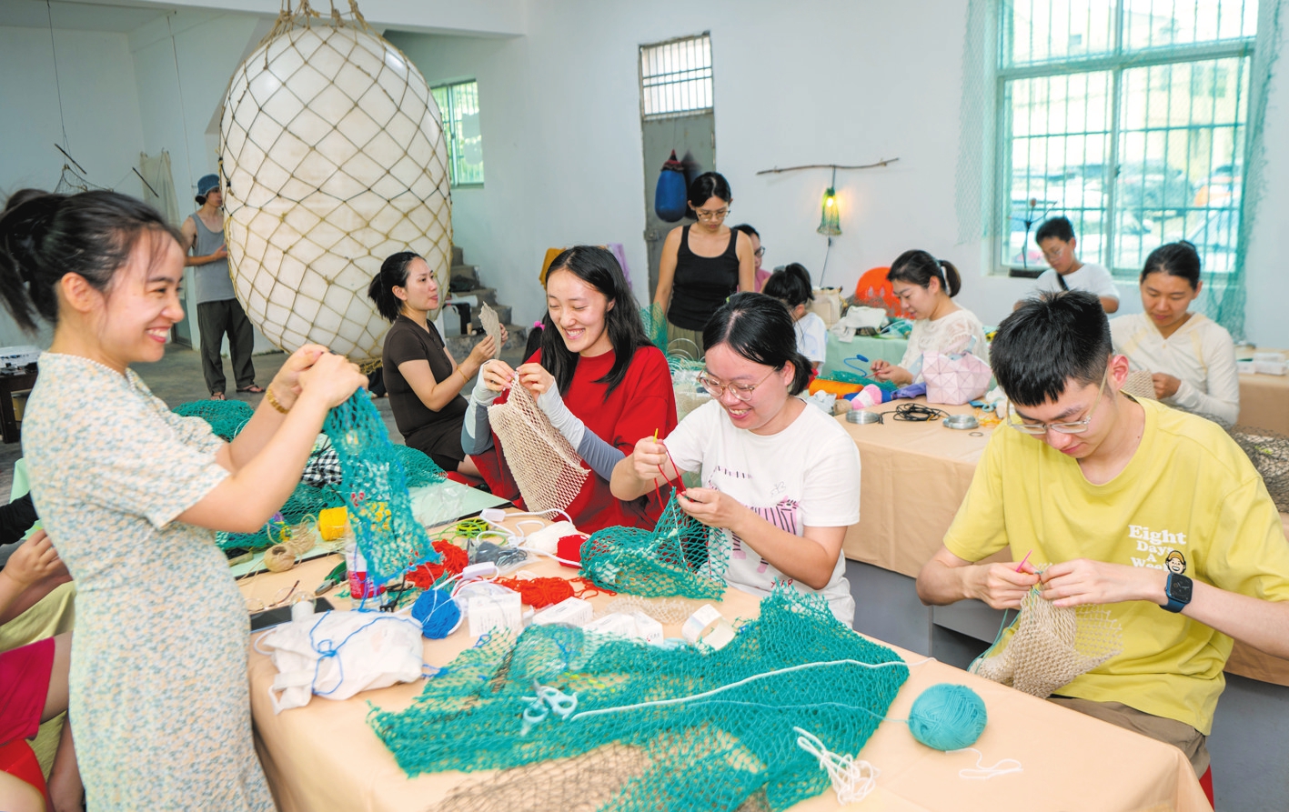 织网体验区内,渔民一边讲述风浪中的打鱼故事,一边手把手教市民游客挑选鱼线,编织专属“渔网兜”,让传统织网技艺成为可触可感的沉浸式体验。
