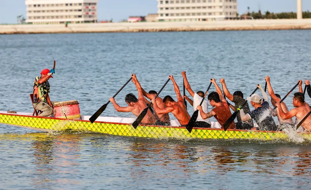 夕阳的金辉洒满渔港码头,海风送来阵阵凉爽。近日,美兰区三联村渔港一改白日的宁静,村民们聚集岸边,目光投向远处海面。那里鼓点渐起,龙舟正在紧张训练。