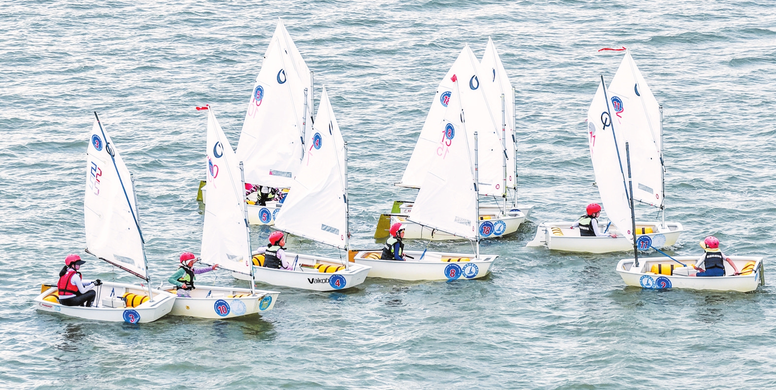 8月15日,2025年海口市中小学生“青椰”体育节暨亲水运动(帆船帆板项目)赛在海口西海岸水域举行。图为参赛小选手驭帆出海。本报记者 康登淋 摄