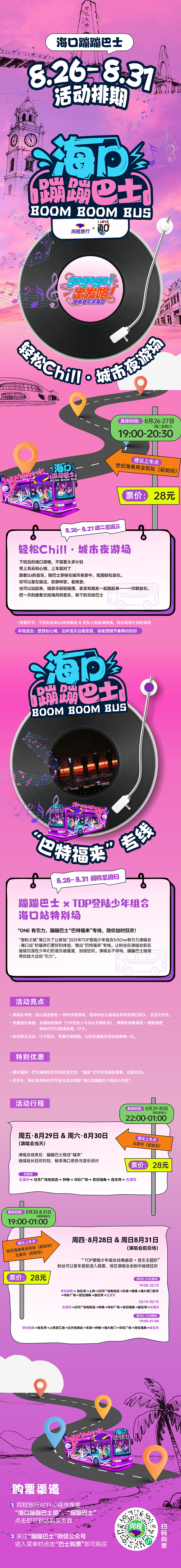 蹦蹦巴士音乐总监Mike将量身打造「ONE有引力」专属蹦迪歌单,全程播放TOP登陆少年组合的热门金曲!从机场到场馆的路上,和全车粉丝一起超大分贝全程跟唱,打造海口街头最拉风的“移动应援声浪”!