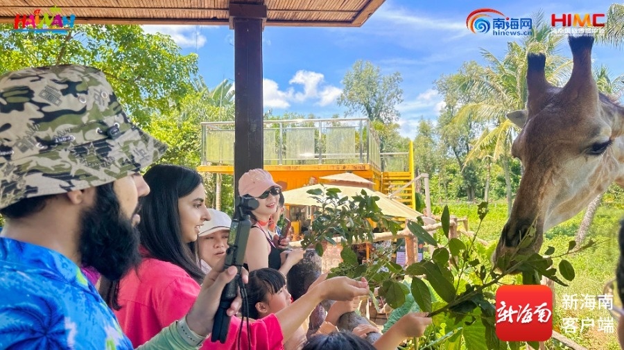 海南旅游国际推荐官和外国留学生们在海南热带野生动植物园游玩体验。主办方供图