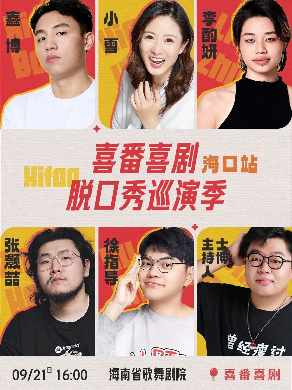 鑫博、张灏喆、徐指导、小雪、李酌妍等多位实力演员将轮番登台,让你在演出中感受到风格各异的幽默表达,体验从生活百态到奇思妙想的多元喜剧内容。