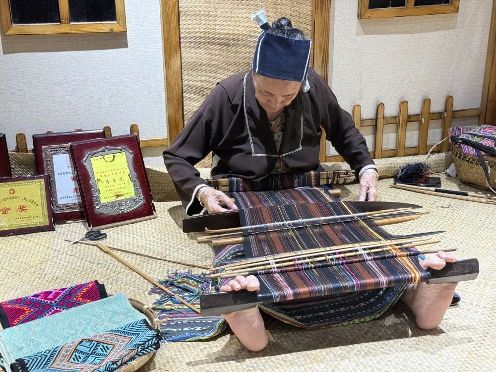 2025年6月24日,海南槟榔谷黎苗文化旅游区里,黎族阿婆符金花正在织黎锦。新华社记者李玥 摄