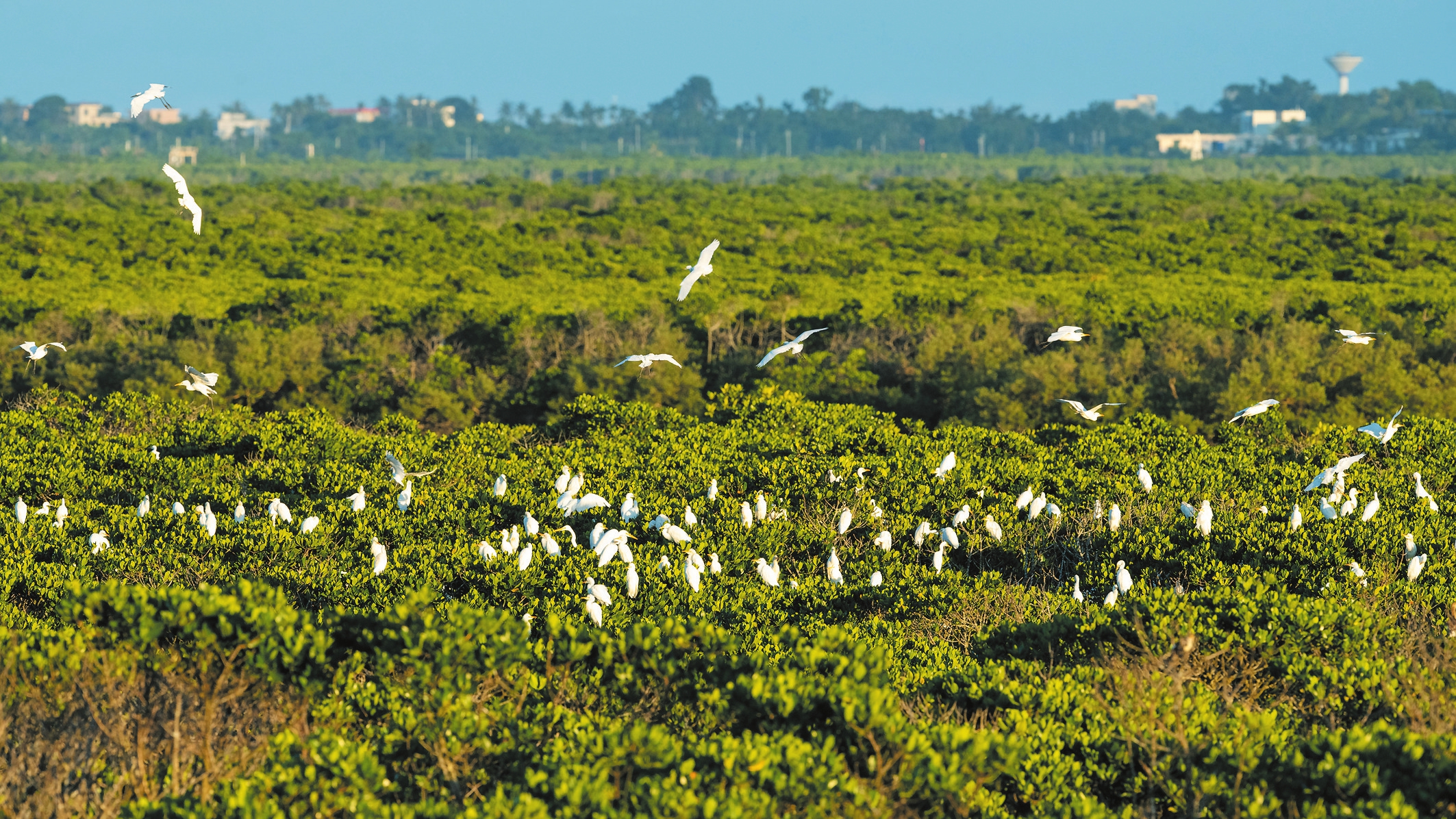 9月11日,海南东寨港国家级自然保护区绿意浓郁的红树间,迎来大批翩跹起舞的白鹭,洁白身影与翠绿植被相映成趣,构成一幅灵动的生态画卷。