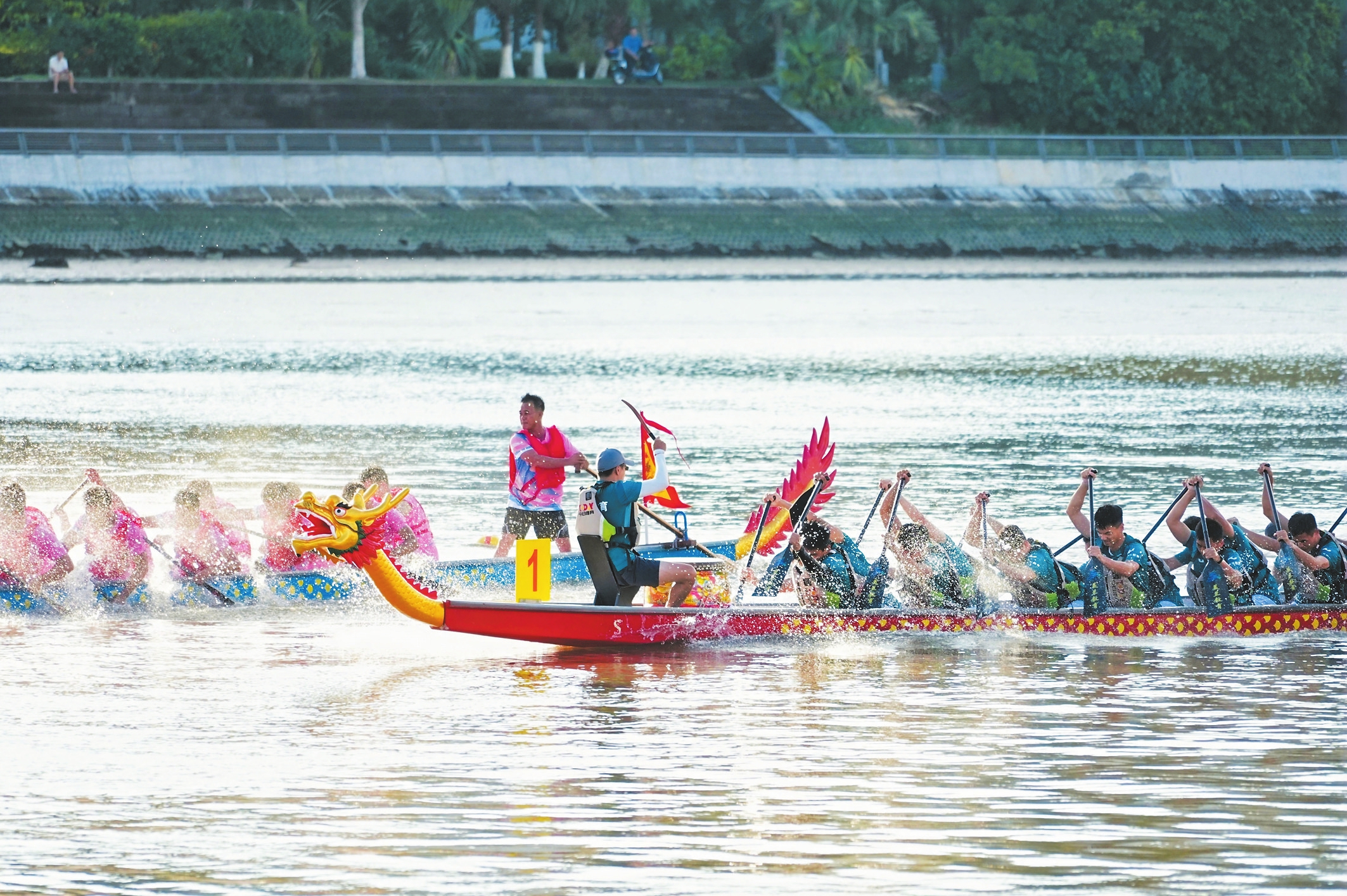 本场赛事延续“体育+文化+娱乐”融合模式,为市民游客带来多维体验。岸边主舞台上,《龙的传人》《娜鲁湾情歌》《幸福中国一起走》等节目轮番上演,用歌舞传递热情与活力。同时,“集赞抽盲盒”互动活动也提升了赛事传播力与参与度。