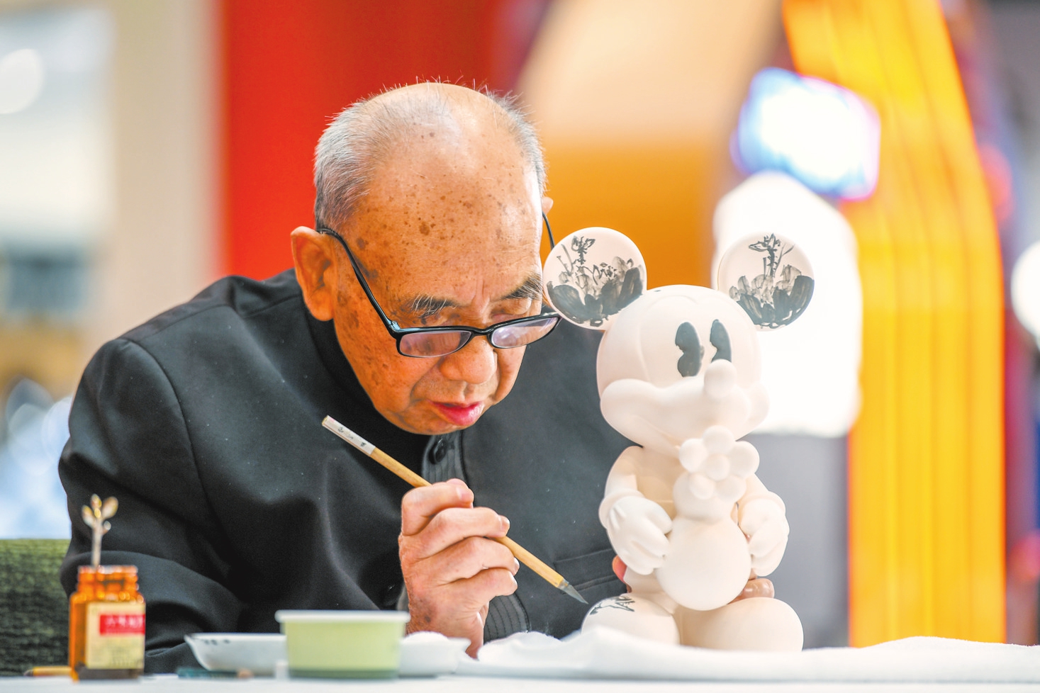 去年底,在海口万象城举办的“又见青花”主题活动现场,国家级非物质文化遗产(手工制瓷)代表性传承人黄云鹏用手绘青花釉里红的方式绘制卡通玩偶,活动吸引了许多市民游客前去欣赏。