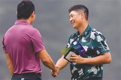 9月23日,海南高尔夫男队选手袁也淳(右)赛后与上海队选手吴阿顺握手致意。 新华社记者 吴壮 摄