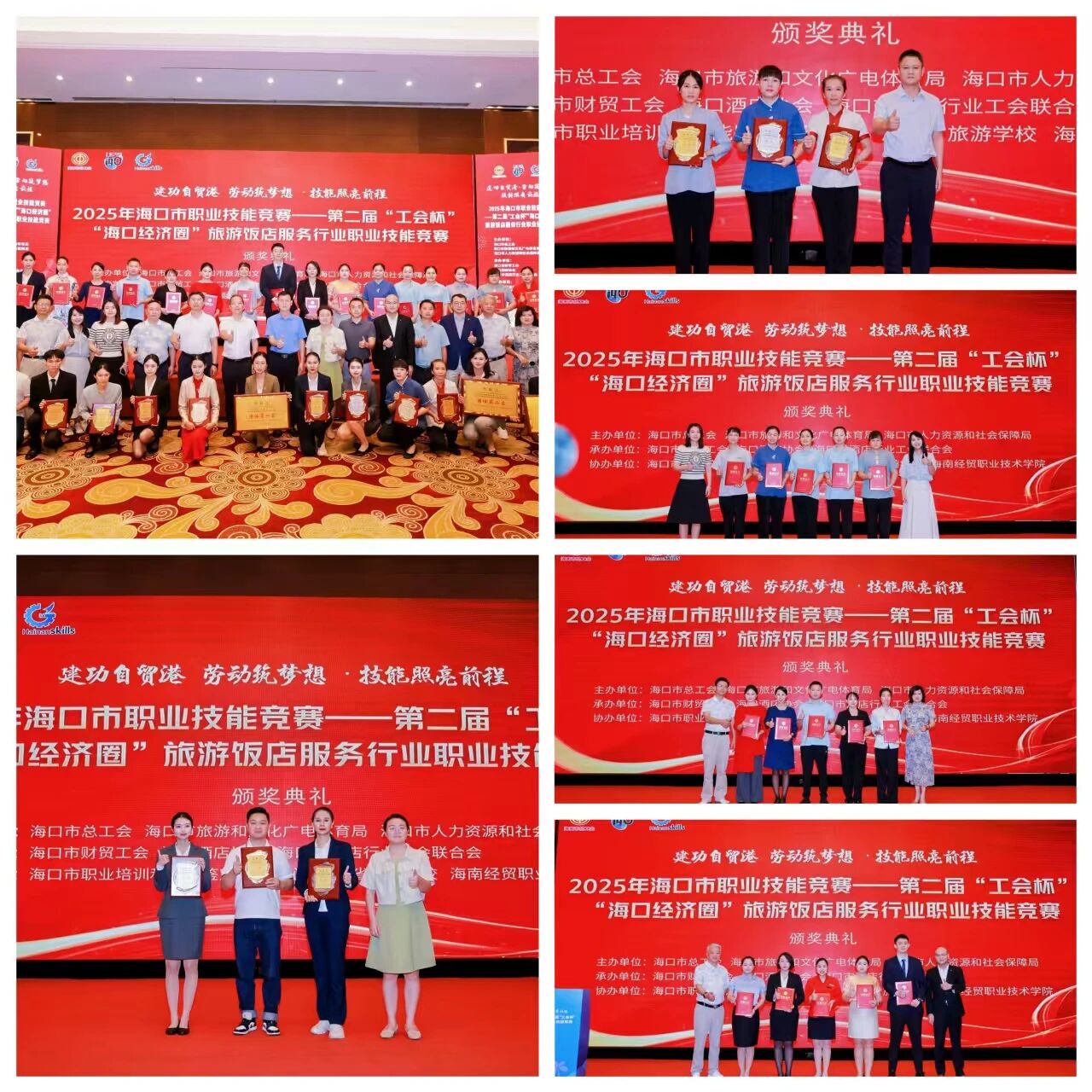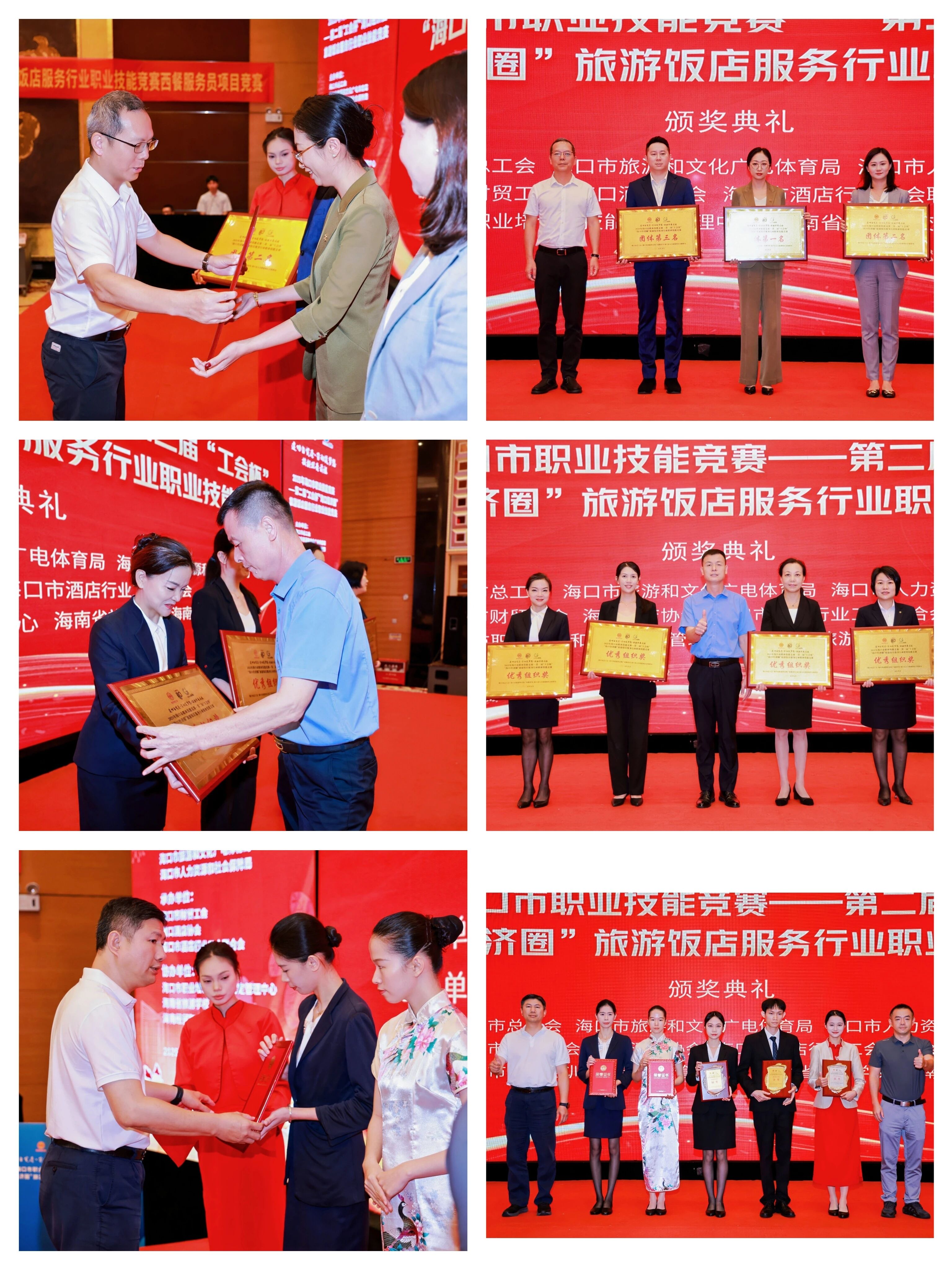 海口市旅游和文化广电体育局市场监管科科长周晖子、海口市人力资源和社会保障局职建科科长吴英全、海口市职业培训和技能鉴定管理中心主任况威等领导嘉宾为获奖选手颁发奖牌和证书。