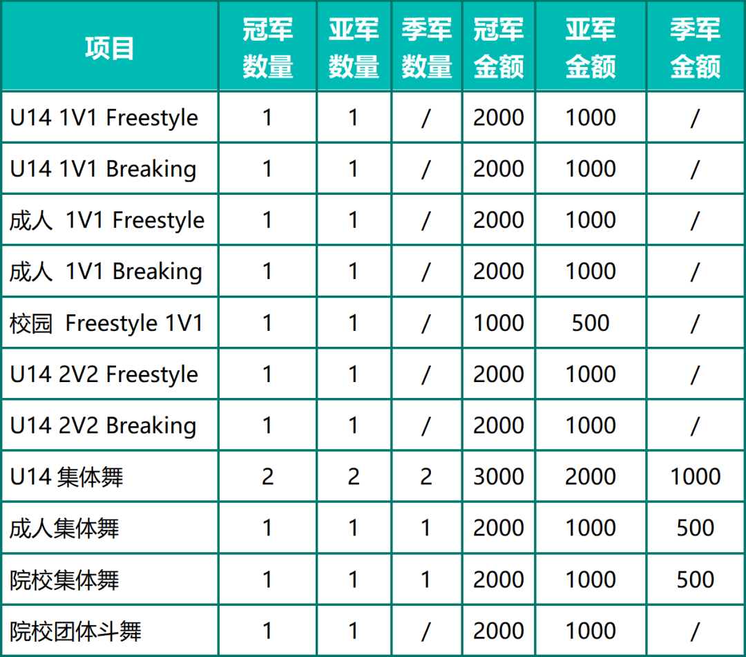 各项竞赛冠军均设置丰厚奖金、定制奖牌及荣誉证书。奖金分配如下图: