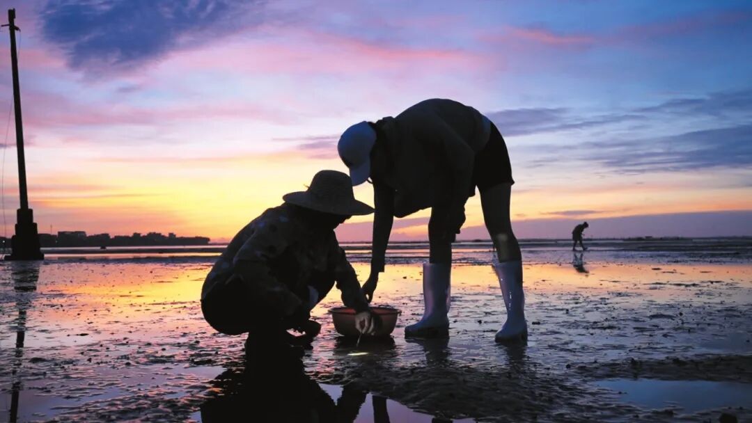 近日,在北港岛滩涂,市民王露一家跟着赶海向导翁琼玉学习钩蛏技巧。如今,北港岛越来越多村民像翁琼玉一样,凭借祖辈传下的赶海经验,兼职赶海向导,开辟出增收新路径。
