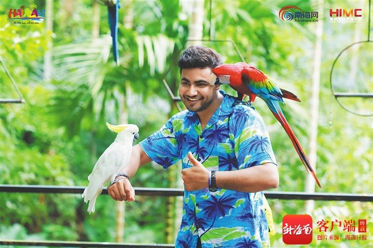 来自巴西的国际推荐官文强在景区和鹦鹉互动。海南省旅游和文化广电体育厅供图