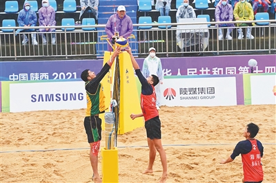 本报海口9月25日讯,9月25日,第十四届全国运动会沙滩排球比赛结束。在男子成年组争夺三、四名比赛中,海南男子沙排队陈秀峰/秦成达1:2不敌上海一队,获第四名,创全运会最好成绩。