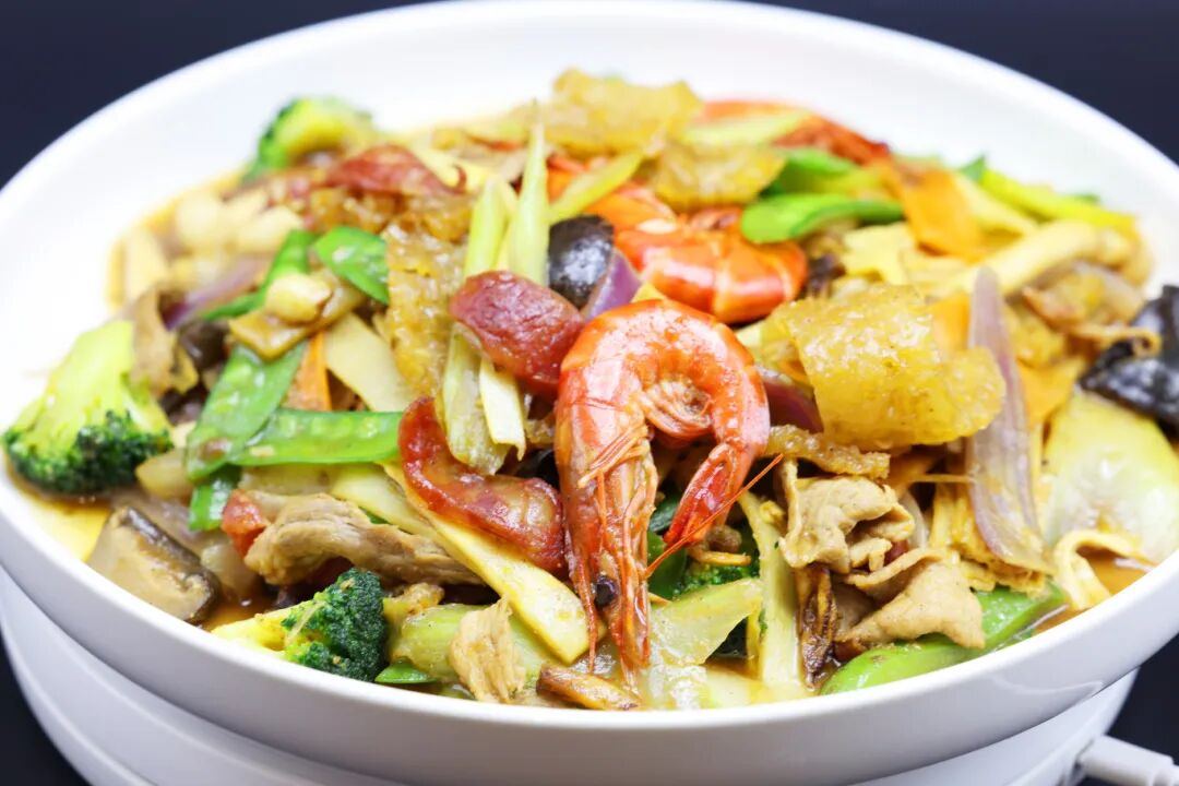 店里的招牌菜都特色鲜明,像海南人最爱的「全家福」这里就有,虾仁、鱿鱼、香肠、腐竹、鲜笋层层叠叠,用料扎实,口味上更胜一筹。