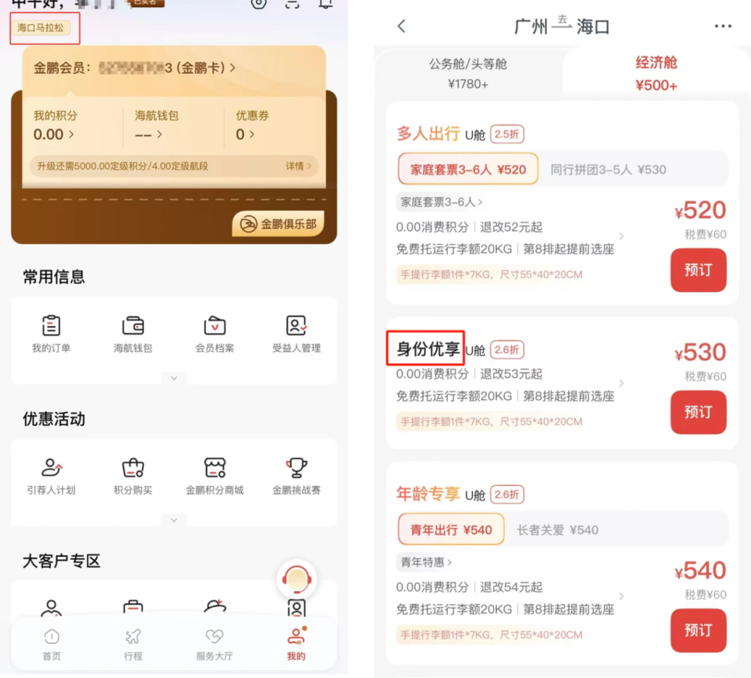 Step5 申请通过后,登录海南航空APP或小程序主页会显示“2025海口马拉松”标识,届时跑友可自行选购2025年12月20日-2026年1月5日期间往返海口的机票,购票时选择“身份专享”即可购买2025海口马拉松专享机票。