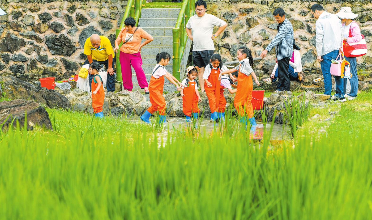 游客在潭丰洋湿地共享农庄体验捉泥鳅。本报记者 康登淋 摄
